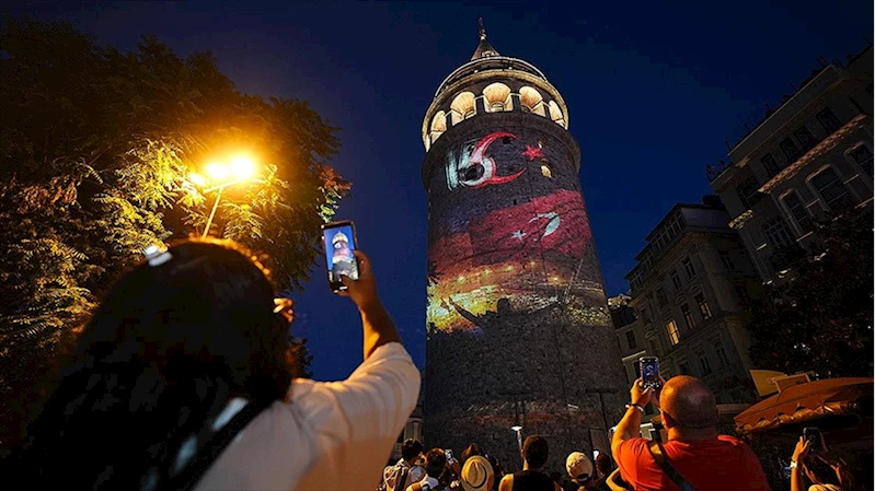 Işık boyama tekniğiyle yapılan etkinlikte, "15 Temmuz" logosu ve "15 Temmuz Milletin Zaferi" yazısı tarihi mekanlara yansıtıldı.