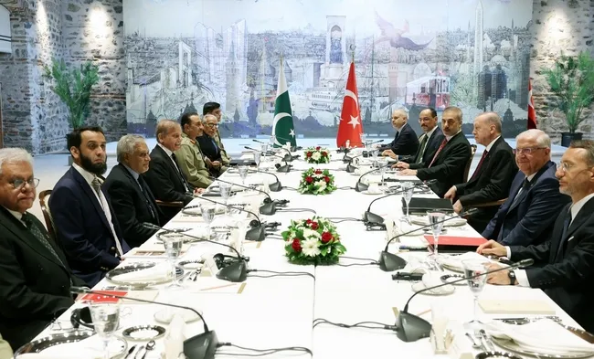 Başkan Recep Tayyip Erdoğan, Milli Savunma Bakanı Yaşar Güler'in havalimanında resmi törenle karşıladığı Pakistan Başbakanı Şahbaz Şerif'i İstanbul'da Cumhurbaşkanlığı Dolmabahçe Çalışma Ofisi'nde kabul etti.