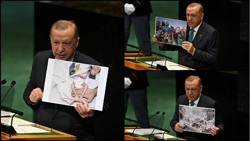 GAZZE (AA) - Cumhurbaşkanı Recep Tayyip Erdoğan, New York'ta düzenlenen BM 80. Genel Kurulunda yaptığı konuşmada, İsrail'in 2 yıldır soykırım ve etnik temizlik suçları işlediği Gazze Şeridi'ndeki insani felaketi belgeleyen fotoğrafları gösterdi.