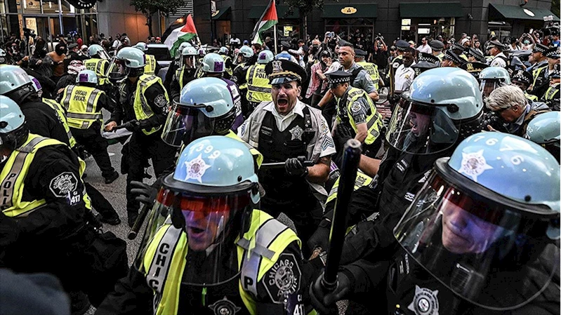CHICAGO (AA) - ABD'de Demokrat Parti Kongresinin düzenlendiği Chicago kentinde Gazze'deki katliamlarına tepki göstermek için İsrail Konsolosluğu önünde toplanan gruba polisin sert müdahalesi sırasında aralarında AA kameramanının da olduğu bazı basın mensupları polisin müdahalesine maruz kaldı.