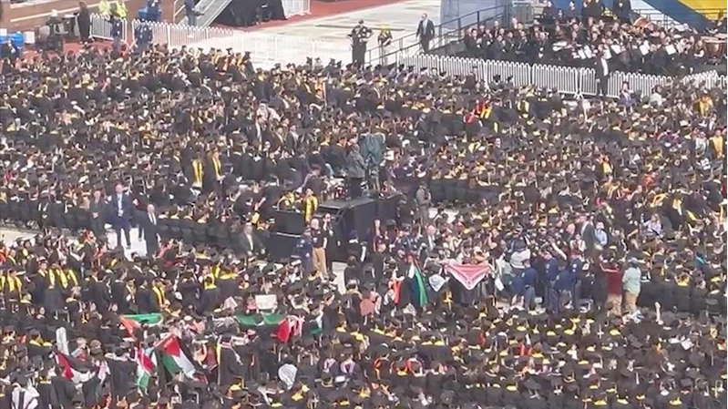 NEW YORK (AA) - Törende bir grup öğrenci, mezuniyet cübbeleri üzerindeki kefiyelerle Filistin bayrağı açtı, soykırım karşıtı sloganlar atarak sahneye doğru yürüdü.