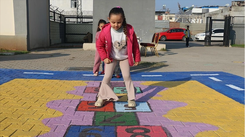 Merkez Yüreğir ilçesindeki ilkokul ve anaokullarını ziyaret eden gönüllüler, okulların bahçelerine seksek, labirent, eşleştirme, dört işlem, alfabe ve köşe kapmaca gibi oyun alanları çizip boyayla renklendiriyor.