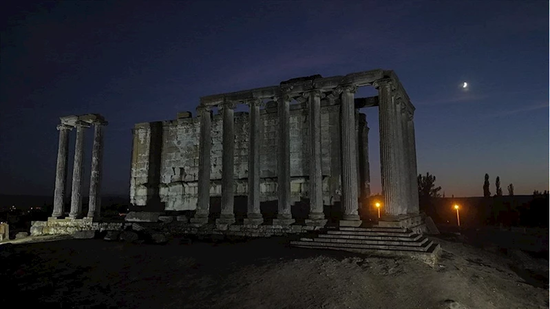 Antik kentteki Zeus Tapınağı'nın gün batımı ve akşamın ilk saatlerindeki ışıklandırılmış manzaraları AA ekibince dronla görüntülendi.
