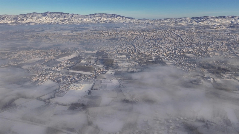 Öte yandan, bölgede ve kentin üzerini kaplayan sis bulutunun, yaklaşık bir haftadır aralıkla devam kar yağışı sonucu beyaza bürünen alanlarla oluşturduğu manzara havadan görüntülendi.