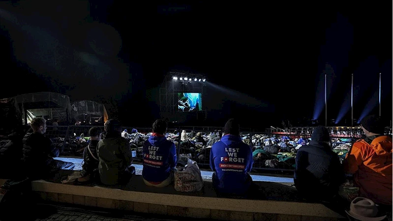 Servis araçlarıyla Anzak Koyu'na gelen katılımcılar, uyku tulumları ve battaniyeler içinde, tören alanına kurulan dev ekrandan Çanakkale Savaşları'na ilişkin belgesel izleyerek ayinin saatini bekledi.