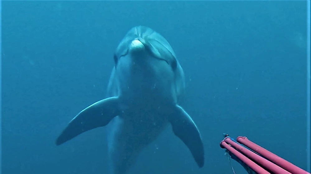 Yunuslardan biri sevimli poz verircesine Atasev'in kamerasına yaklaştı. Bir süre kameraya bakıp başını sallayan yunus, daha sonra Atasev'in yanından uzaklaştı.