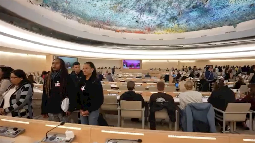 ABD'nin Birleşmiş Milletler (BM) İnsan Hakları Konseyi Daimi Temsilcisi Büyükelçi Michele Taylor'ı, BM İnsan Hakları Komitesi'nde konuşma yaptığı sırada sivil toplum kuruluşu (STK) temsilcileri, ayağa kalkıp sırtlarını dönerek protes