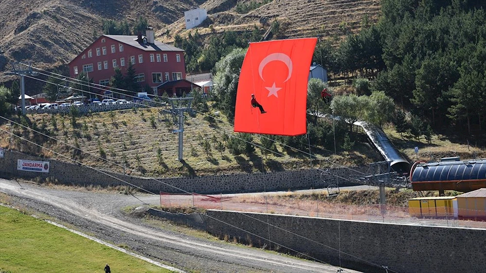 Pistin orta kısmına halat üzerinde kayarak gelen komandolar, 54 metrekare Türk bayrağını açarak havada asılı vaziyette selam durdu ve ardından aşağıya halatlarla iniş yaptı.