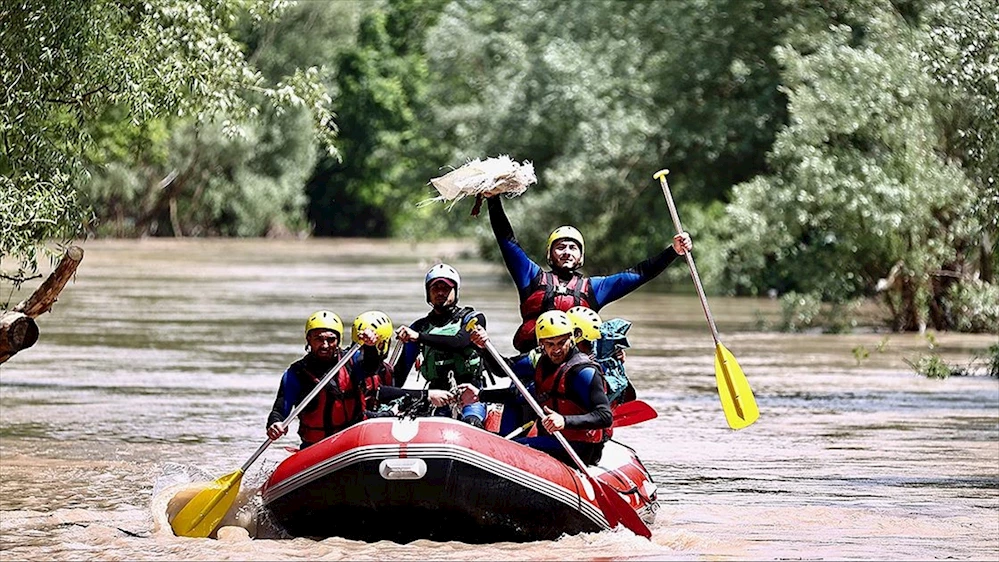 Rafting kıyafetlerini giyip çöp poşetlerini yanlarına alan Demircan ve sporcular, 16 kilometrelik parkurda kürek çekmenin yanı sıra su yüzeyi ve kenarlarında temizlik yaptı.