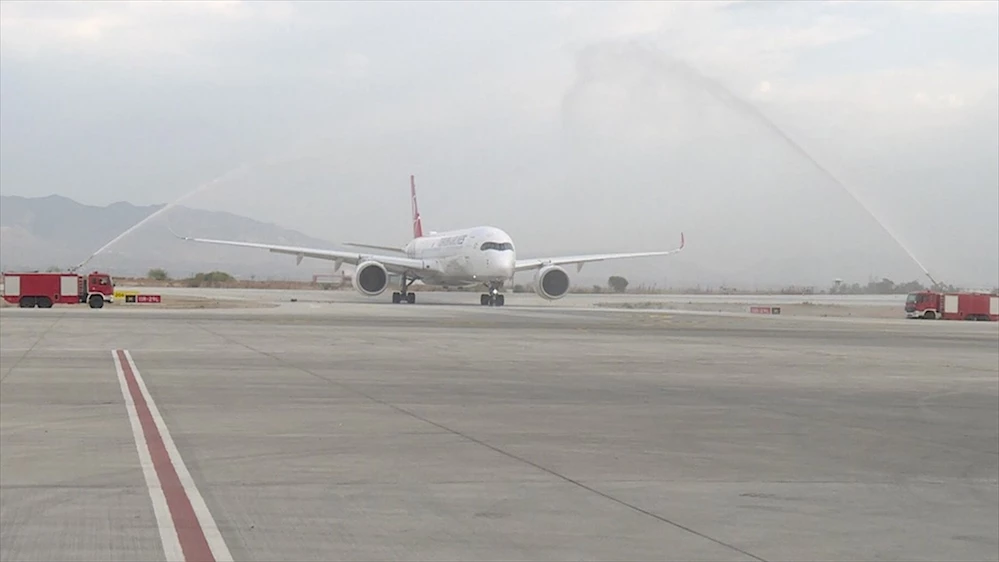 Piste ilk inişi sebebiyle su takıyla karşılanan uçak, daha sonra yolcularını indirdi.