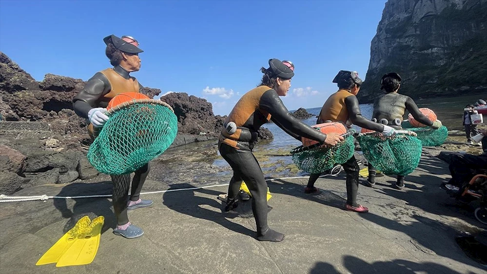 JEJU (AA) - Üzerinde 370 volkanik tepe bulunan Jeju Adası'nda yaşamlarını sürdüren Haenyeolar, 9 metre derinliğe kadar tüpsüz dalış yaparak yaklaşık 1,5 dakika su altında kalabiliyor.