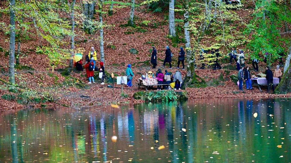 Bolu Yedigöller Milli Parkı'nı ziyaret edenler, sonbahar renkleriyle bütünleşen doğal manzarada vakit geçiriyor.