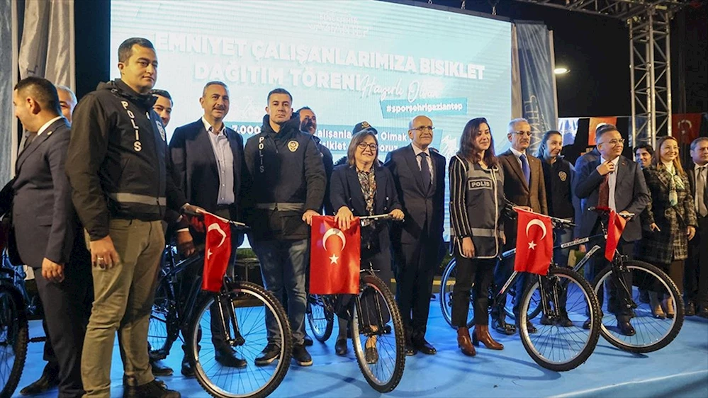 Hazine ve Maliye Bakanı Mehmet Şimşek ile Ulaştırma ve Altyapı Bakanı Abdulkadir Uraloğlu, Gaziantep'te polis mensuplarına bisiklet dağıtımı için düzenlenen törene katıldı.
