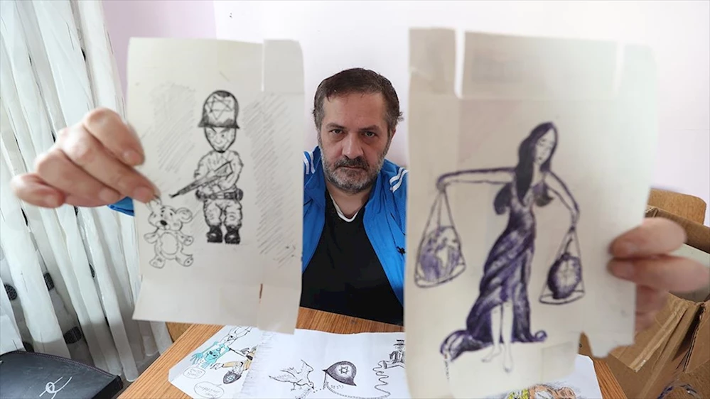 Düzce'de yaşayan ressam Hasan Canbaz, İsrail'in Gazze'ye saldırılarına dikkati çekmek için atık kağıt ve kutulara resim çiziyor.