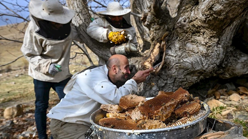 Van'da arıcılık yapan 'Arı adam' lakaplı Abdulvahap Semo, Çatak ilçesinde kovanlardan kaçan arıların yuva yaptığı ceviz ağacının kovuğundan 5 kilogram bal çıkardı.