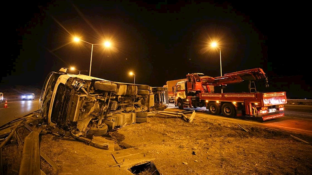 MERSIN (AA) - Sürücünün adı öğrenilemeyen yaş meyve ve sebze yüklü 05 RA 450 plakalı tır, TAG Otoyolu Akgedik mevkisinde bir araçtan sızdığı değerlendirilen mazot nedeniyle kayganlaşan yolda bariyerlere çarptı.