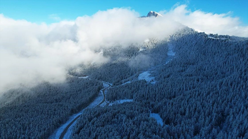 Kastamonu'da kar ve sisle buluşan ormanlar dronla görüntülendi