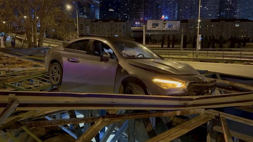 İSTANBUL (AA) - Acıbadem Mahallesi Çeçen Sokak’tan çıkarak Uzunçayır Kavşağı'na dönmeye çalışan C.T. idaresindeki 34 GJJ 599 plakalı otomobil bariyerlere çarparak arkasındaki köprüde asılı kaldı.