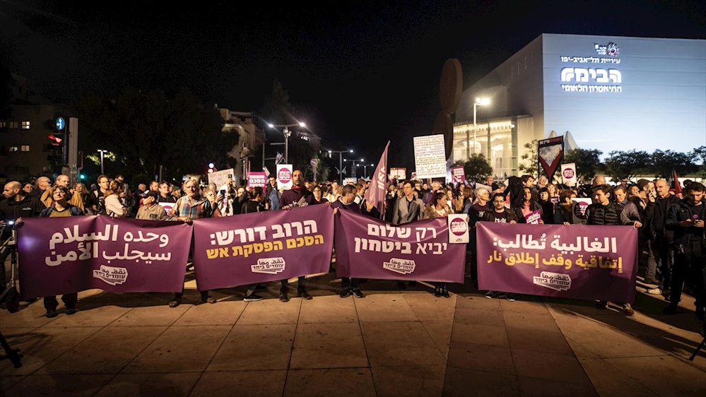 Tel Aviv'de düzenlenen gösteride yüzlerce İsrailli, Gazze'ye saldırıların bitmesi ve barışın sağlanması yönünde sloganlar attı.