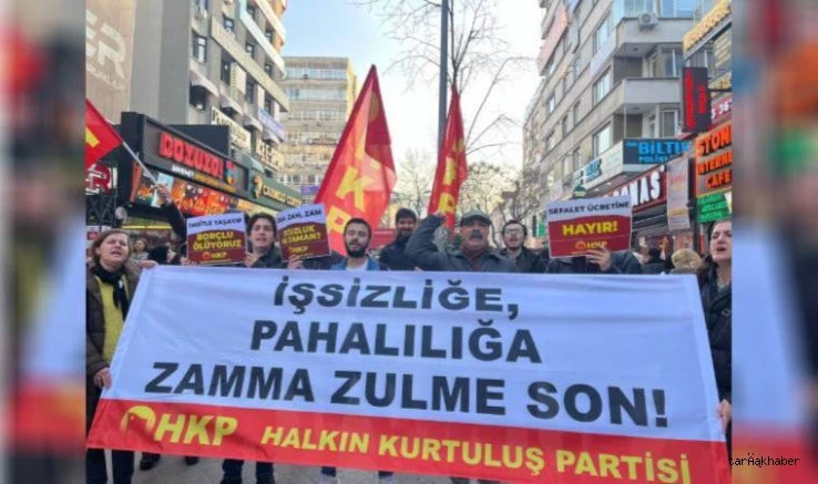 Ankara Kızılay’da bir araya gelen Halkın Kurtuluş Partisi (HKP) üyeleri, asgari ücretin 17 bin 2 lira olarak belirlenmesine tepki gösterdi. HKP Ankara İl Yöneticisi Bayram Karkın, “Asgari ücret bir kez daha patronların isteğine göre belirlendi. Açıklanan asgari ücret, değil dört kişilik bir aileyi, bekâr bir işçiyi dahi geçindirmeye yetmiyor” dedi.