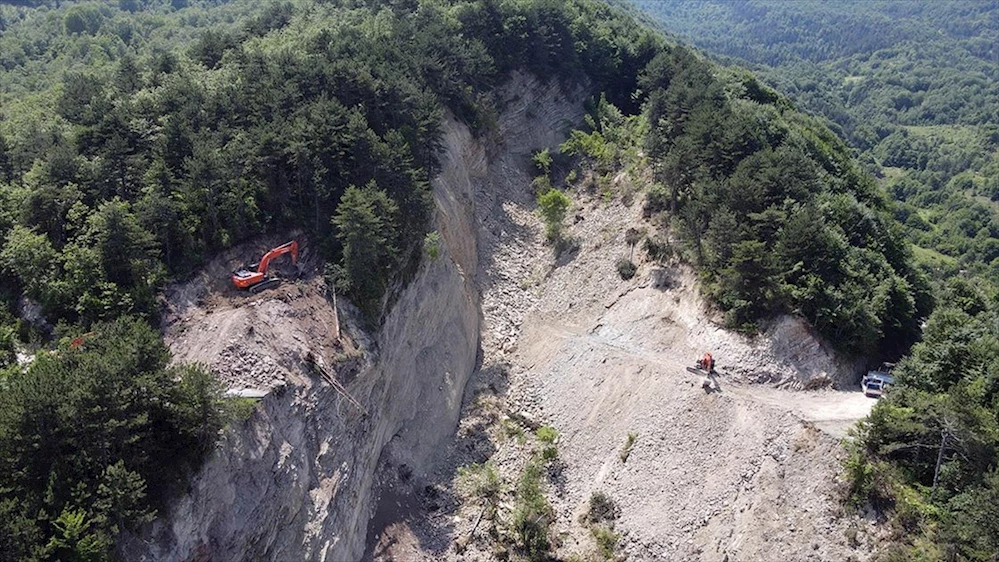 Kastamonu'nun Çatalzeytin ilçesinde 5 Haziran'daki şiddetli yağışlar nedeniyle yaklaşık 500 metre kayan Küre Dağları Karacakaya mevkisindeki köy grup yolunun onarılması için çalışmalar sürüyor.