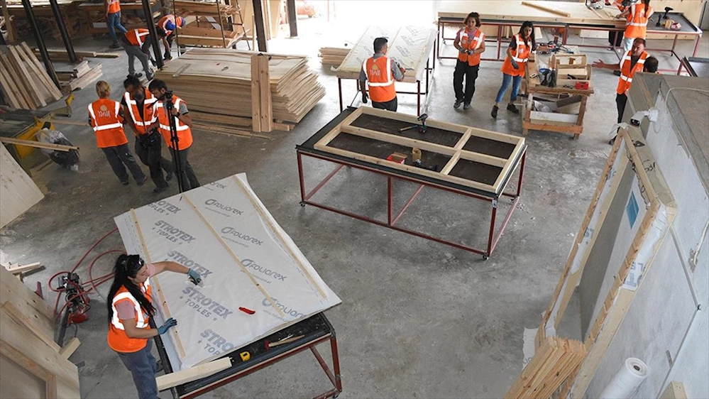 Hatay'ın Samandağ ilçesinde gönüllüler tarafından kurulan ve ahşap ev üretimi yapılan atölyede, depremzedelere istihdam sağlanıyor.