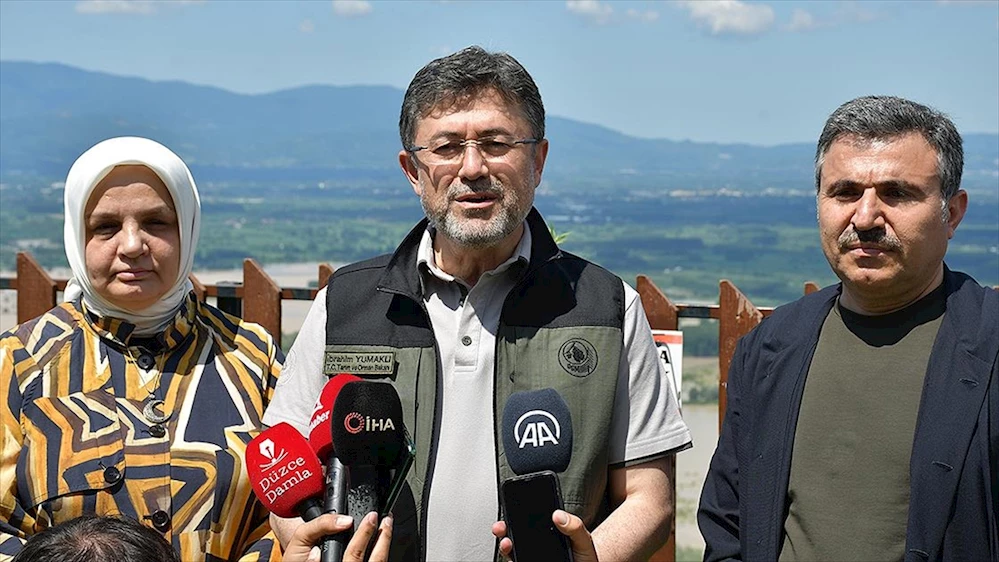 DÜZCE (AA) - Gölyaka ilçesine bağlı Toptepe kırsalında incelemelerde bulunan Tarım ve Orman Bakanı İbrahim Yumaklı, yaklaşık 500 metre rakımdaki seyir terasından sular altında kalan ekili araziler ile ormanlık alanı gözlemledi.