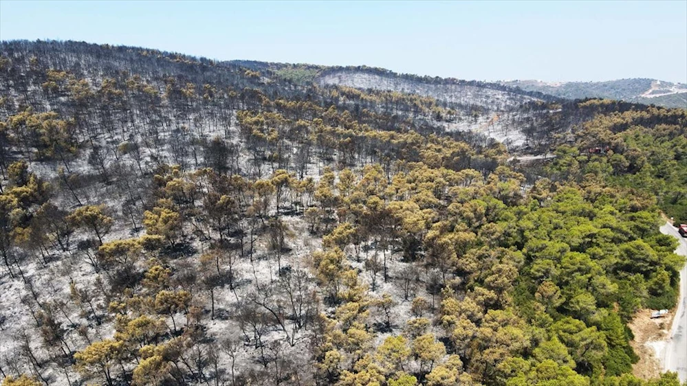 Muğla'nın Milas ilçesinde çıkan yangından zarar gören ormanlık alanlar, havadan görüntülendi.