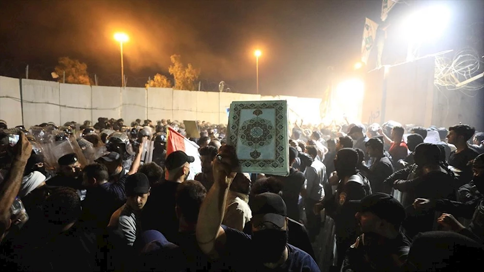 Sadr Hareketi yandaşları, İsveç Büyükelçiliği yakınlarına gelerek beklenen söz konusu eylemi protesto etmeye başladı. Göstericiler İsveç hükümetine karşı slogan atarak, büyükelçilik bahçesine girdi.