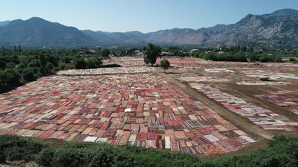 Antalya'da 40 dereceyi aşan hava sıcaklığı Döşemealtı ilçesinde tarlalara serilen binlerce el dokuması halı ve kilimin renklerinin daha kısa sürede daha fazla pastelleşmesini sağlayacak.