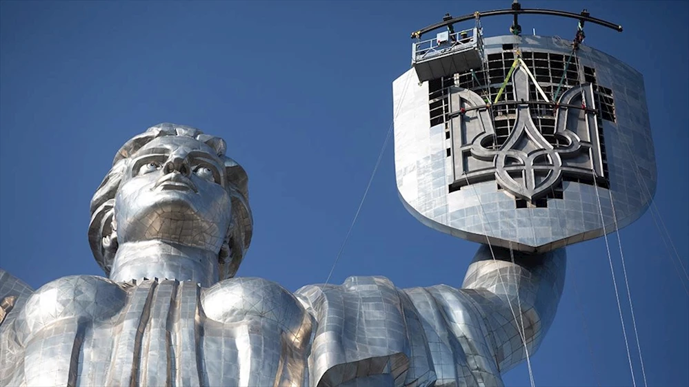 Ukrayna'nın simgesi ve dünyanın en büyük heykellerinden Anavatan'a güneş, buğday başağı, orak ve çekici içeren eski Sovyetler Birliği arması indirilerek 'Trizub' diye bilinen Ukrayna arması takıldı.