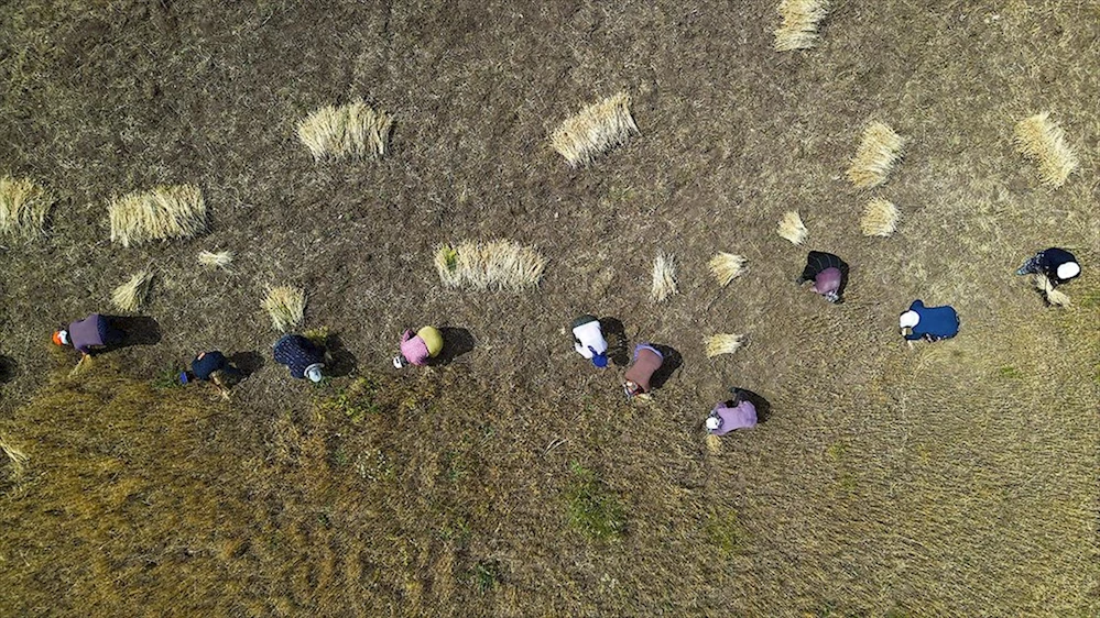 Bayburt'un Aydıntepe ilçesinin kırsal kesimindeki buğday tarlasını hasat etmeye uygun tarım makinesi bulunamayınca, köy kadınları ellerine orak alarak sorunu imece usulüyle çözdü.