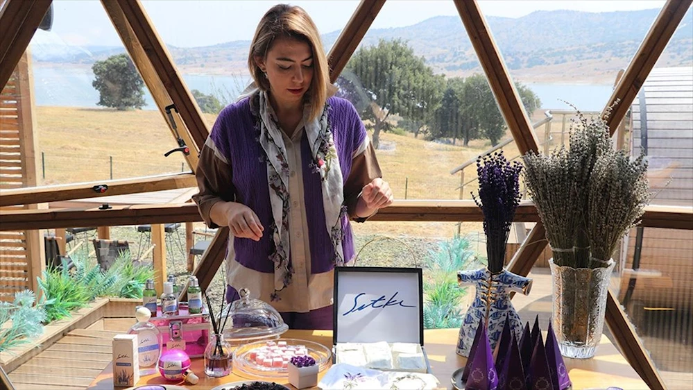 Kütahyalı kadın girişimci Nida Olçar, kendisine ait arazide yetiştirdiği lavantaları işleyerek esans, kolonya, lokum gibi ürünlere dönüştürüyor.