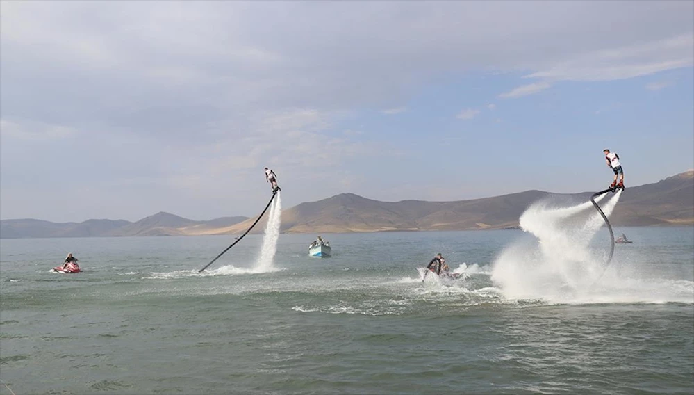 Ağrı Taşlıçay Belediyesinin destekleriyle göle gelerek gösteri yapan flyboard sporcuları, bölgeye hayran kaldı.