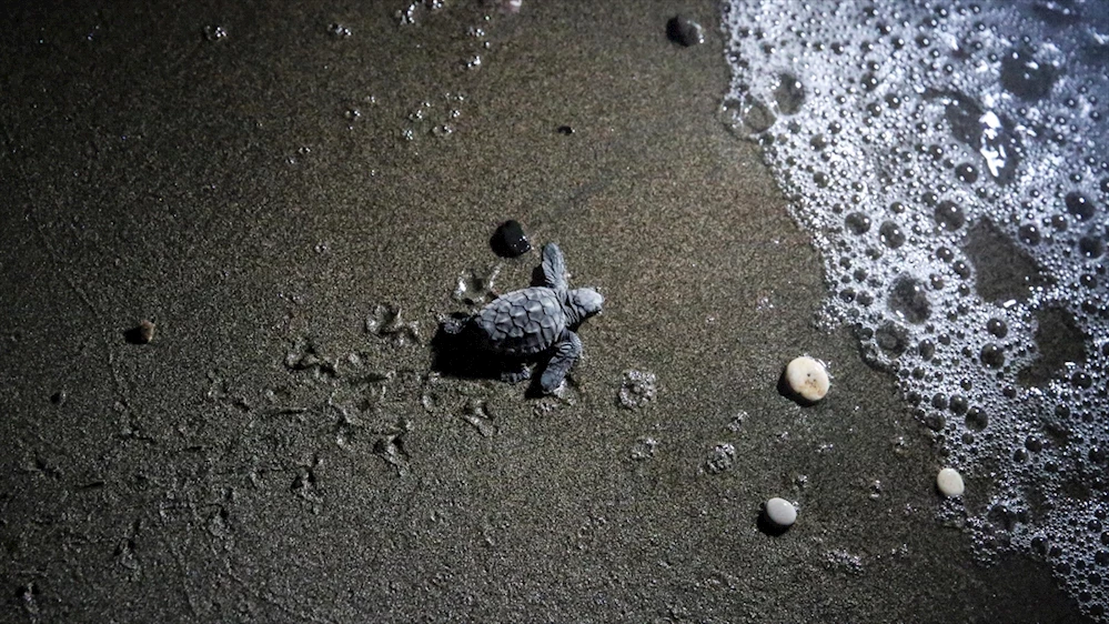 Denize ulaşmak için kumsala ilk adımlarını atan minik kaplumbağaların gece saatlerindeki zorlu yolculuğu, Anadolu Ajansı ekibince görüntülendi.