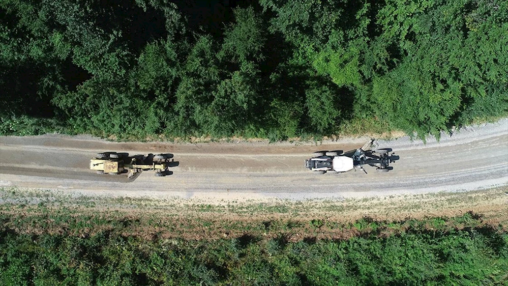 Yeşil yelekliler iş makineleriyle asfalt kaplanacak yolları temizleyip ardından dolgu malzemesi ile hazır hale getiriyor.