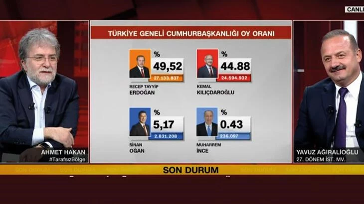 Yavuz Ağıralioğlu seçim sonuçları için tahmininin sorulması üzerine ise Kılıçdaroğlu'nun 2. turda seçimi kazanamayacağını düşündüğünü söyledi.