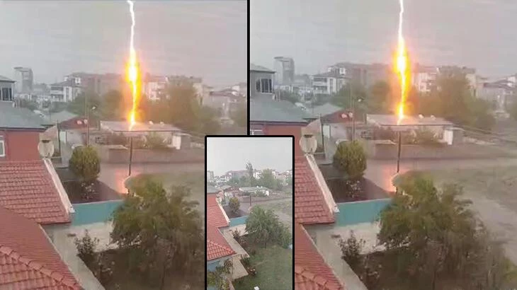 Iğdır, iki günden beri yağmurlu bir havanın etkisi altında. Bugün de kapalı havayla uyanan kentte yağmur öncesi Emek Mahallesi'nde bir kişi; evinin penceresinden cep telefonuyla görüntü alırken birden karşıdaki tek katlı, bahçeli eve yıldırım düştü. Alevlerden korkan vatandaşın bağırarak cep telefonunu bırakması görüntülere yansıdı.