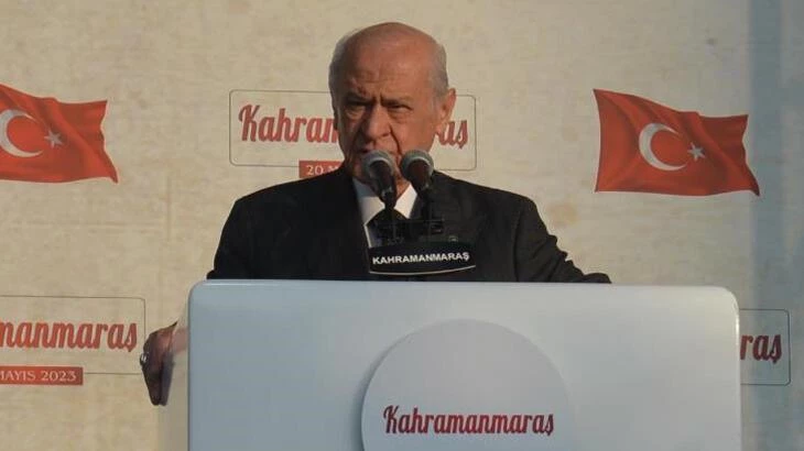 '28 Mayıs'ta Cumhurbaşkanı Recep Tayyip Erdoğan'ı 13. dönem cumhurbaşkanı yapmak mecburiyetindeyiz' diyen Bahçeli, 'Bu oylar Kahramanmaraş'ta doruğa zirveye çıkmış, yüzde 71’e ulaşmıştır. Şimdi yeni bir seçimin tekrar arifesindeyiz. Aziz Kahramanmaraşlılar yüzde 71’den geri adım yok. Olmamalı. O sebepten dolayı sandığa nasıl gittiysek 28 Mayıs'ta tekrar gitmeliyiz. Sandıkta elimize alıp Sayın Recep Tayyip Erdoğan'a ve onu oluşturan Cumhur İttifakı partilerine oy verdiğiniz gibi bu kez iki aday üzerinde tek bir vuruşu Sayın Cumhurbaşkanımız Recep Tayyip Erdoğan'a yaparak 28 Mayıs'ta onu ikinci dönem, bir başka ifadeyle 13. dönem Cumhurbaşkanı yapmak mecburiyetindeyiz. Böyle bir çabaya söz veriyor muyuz? Sandığa gidiyor muyuz? Recep Tayyip Erdoğan diyor muyuz? 13. cumhurbaşkanını seçiyor muyuz? Öyleyse komşu bir ilin çocuğu olarak size bir şey söylüyorum. Adana'da çok konuşulur. Karada yüz, denizde yüz, havada yüz, ama 14 Mayıs'ta 71 noktayı geçmiş bir Kahramanmaraş için şimdi 28 Mayıs'ta Kahramanmaraş'ta yüz diyoruz. Söz mü? Havada, karada denizde olduğu gibi Türkiye'yi yeni bir yüzyılda yüzüncü yıl dönüm olarak kutlayacak mıyız?” şeklinde konuştu.