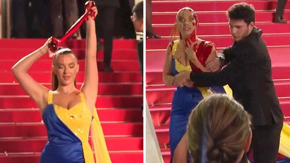 Üzerinde Ukrayna bayrağının renklerinden oluşan bir elbise giyen kadın, Cannes Film Festivali'ne giderek savaşın durdurulması için protesto yaptı. Binlerce kişinin önünde üzerine sahte kan döken kadın, güvenlik görevlileri tarafından u