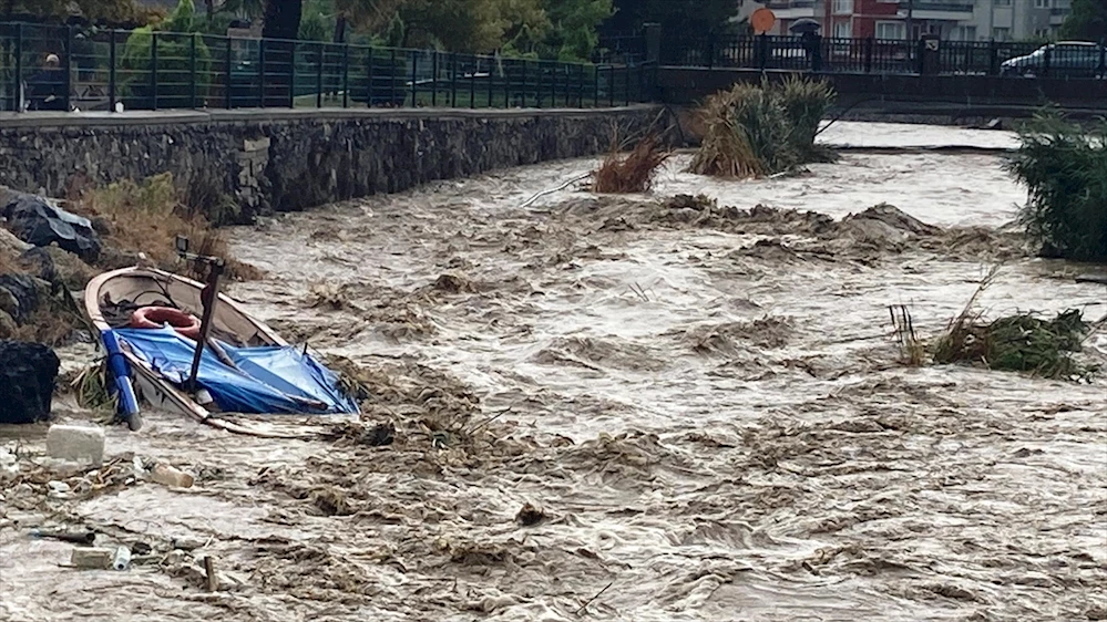 Çanakkale'nin Lapseki ilçesinde etkili olan sağanak nedeniyle Kocabaş Çayı'nın su seviyesi yükseldi, deniz suyunun rengi değişti.