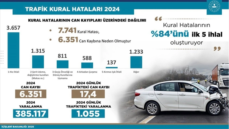 ANKARA (AA) - İçişleri Bakanı Ali Yerlikaya, NSosyal hesabından yaptığı açıklamada, 2024 yılında 6 bin 351 kişinin trafik kazalarında hayatını kaybettiğini, bunun, her gün ortalama 17,4 insanın toprağa verilmesi olduğunu belirtti.