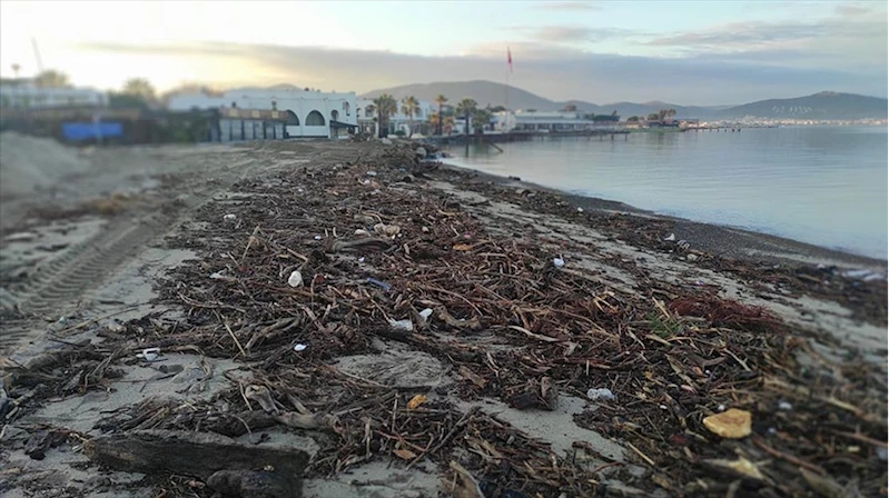 BALIKESIR (AA) - İlçede dün etkili olan sağanak ve lodosla yükselen dalgaların sahile sürüklediği ağaç parçaları ve diğer çöpler, plajı kapladı.