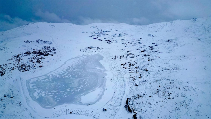 Yüzeyi buz tutan gölet ve çevresindeki karla kaplı dağlar, havadan görüntülendi.