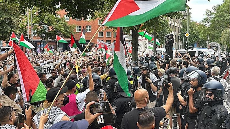 Buradan yürüyüşe geçen göstericiler, Filistin bayrakları ile "Bir soykırım diğerini haklı çıkarmaz", "Almanya'nın sessizliği suç ortaklığıdır", "15 bin çocuk öldürüldü" ve "Bütün ebeveynler aynı dilde ağlar" yazılı pankart ve dövizler taşıdı.
