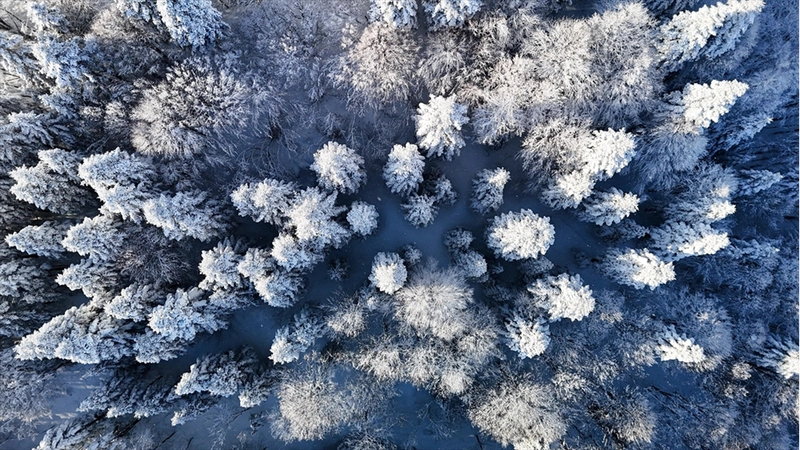 Çam, kestane, akasya, köknar ve gürgen ağaçlarının arasında yolculuk imkanı sunan Çam Dağı'ndaki beyaz örtü havadan görüntülendi.