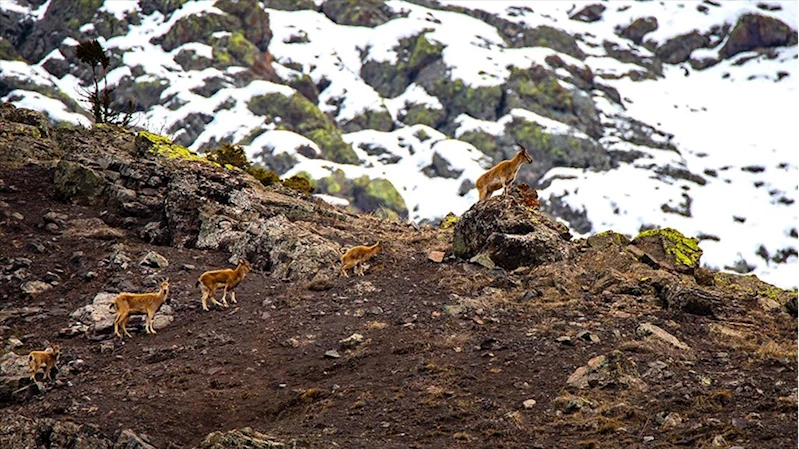 Yaban keçilerinin sürü halinde kayalıklarda ve yer yer karlı dağlardaki gezintisi, AA ekibince görüntülendi.