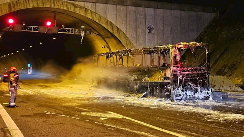 BURSA (AA) - İstanbul-İzmir otoyolunda Kocaeli'den Bergama'ya hareket eden Mürsel Duran yönetimindeki 41 ACR 055 yolcu otobüsü, Orhangazi Tüneli girişinde henüz belirlenemeyen nedenle alev aldı.