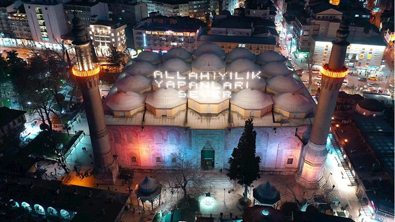 Bursa'daki tarihi Ulu Cami'ye "Allah iyilik yapanları sever" yazılı mahya asıldı