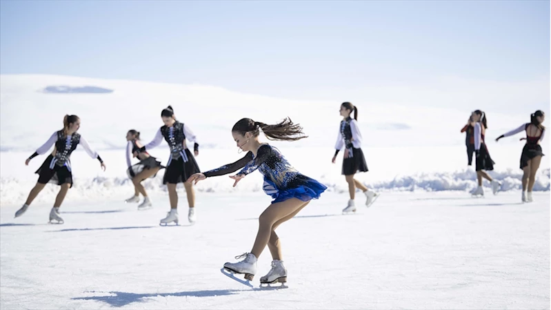 Buzla kaplı Çıldır Gölü üzerinde "Senkronize buz pateni gösterimi" yapıldı
